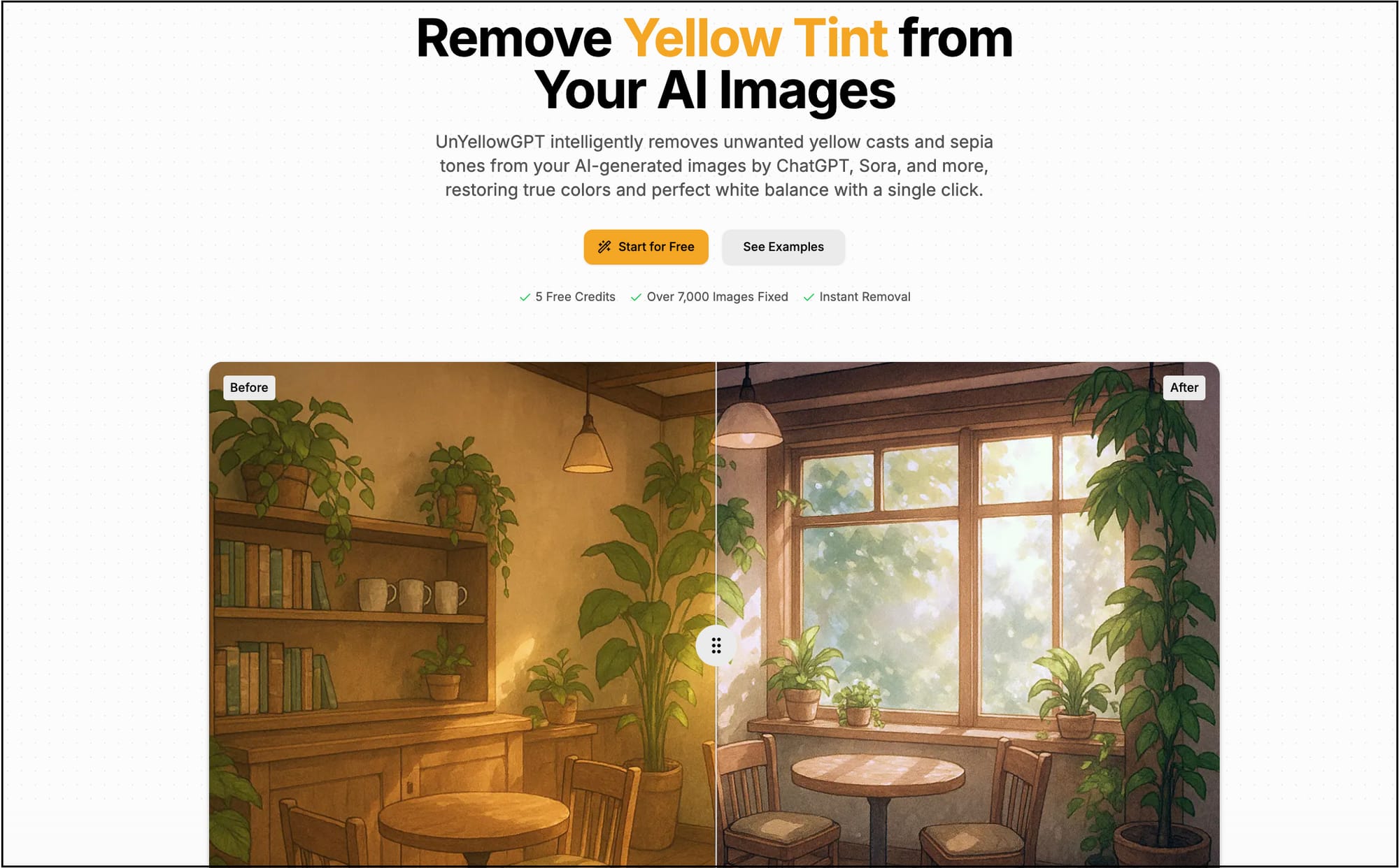 UnyellowGPT est un outil précisément dédié à cette tâche : corriger le filtre jaunie des images générées sur Chat. Il peut sembler contre intuitif de payer pour une édition si simple. Heureusement, l'outil vous offre 5 crédits gratuits à l'inscription.