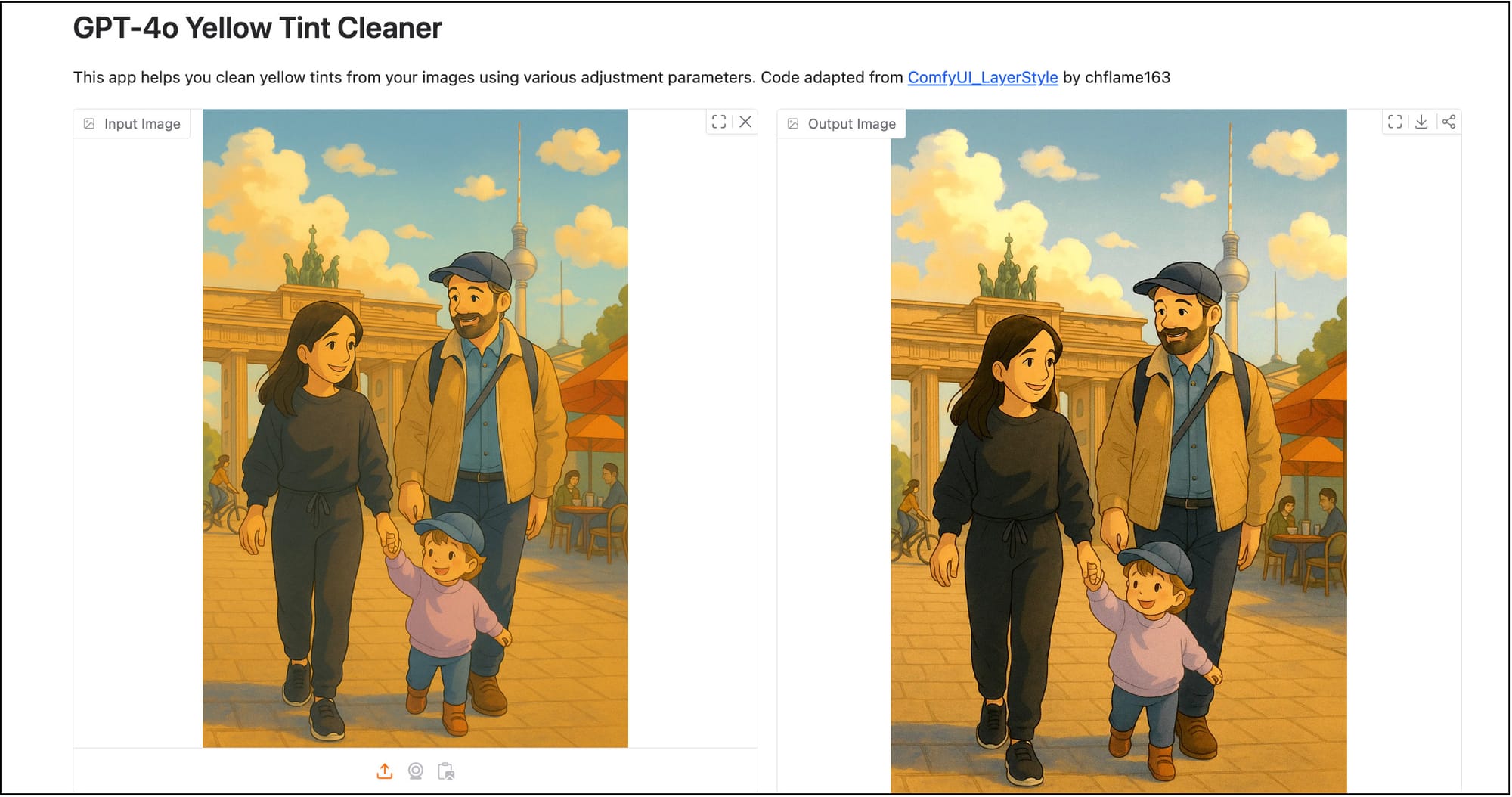 Sur Hugging Face, cet outil "GPT Yellow Tint Cleaner" est gratuit, mais l'édition est très subtile, et l'effet jauni tend à subsister, bien que légèrement amoindri. Le contraste est aussi sensiblement boosté.