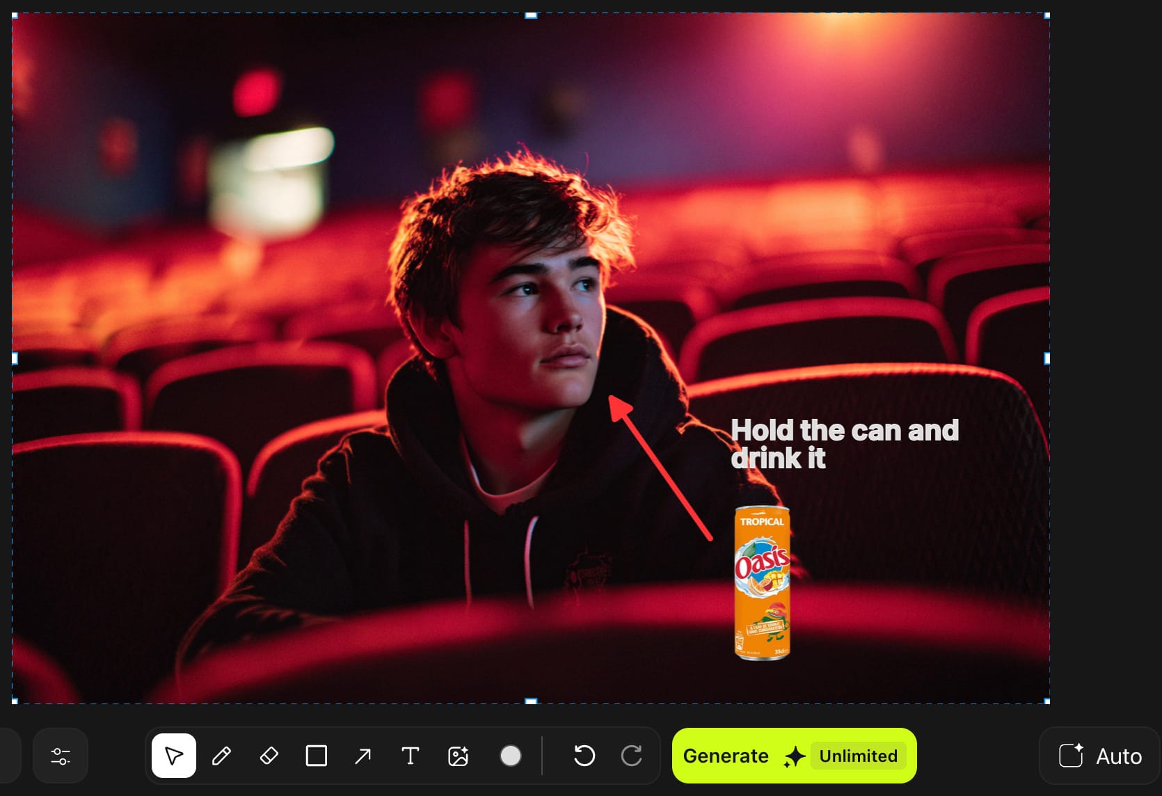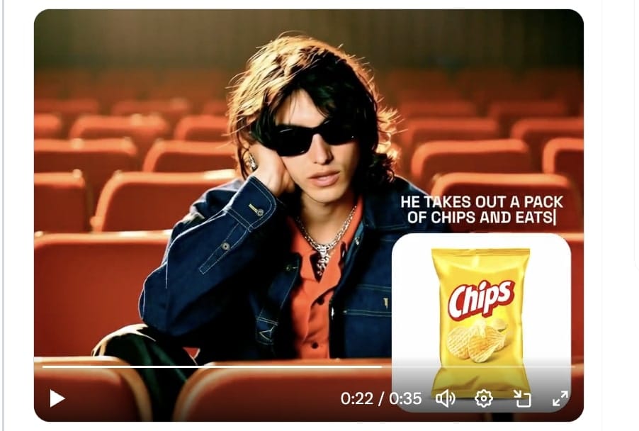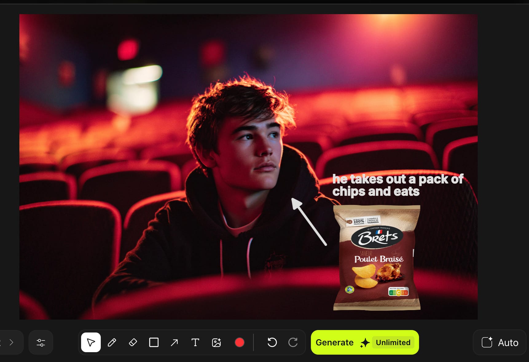 Pour ce faire, et en bon breton que je suis, j'ai choisi d'intégrer un paquet de chips Bret's au visuel d'un ado au ciné (visuel lui même généré en amont sur Midjourney) :