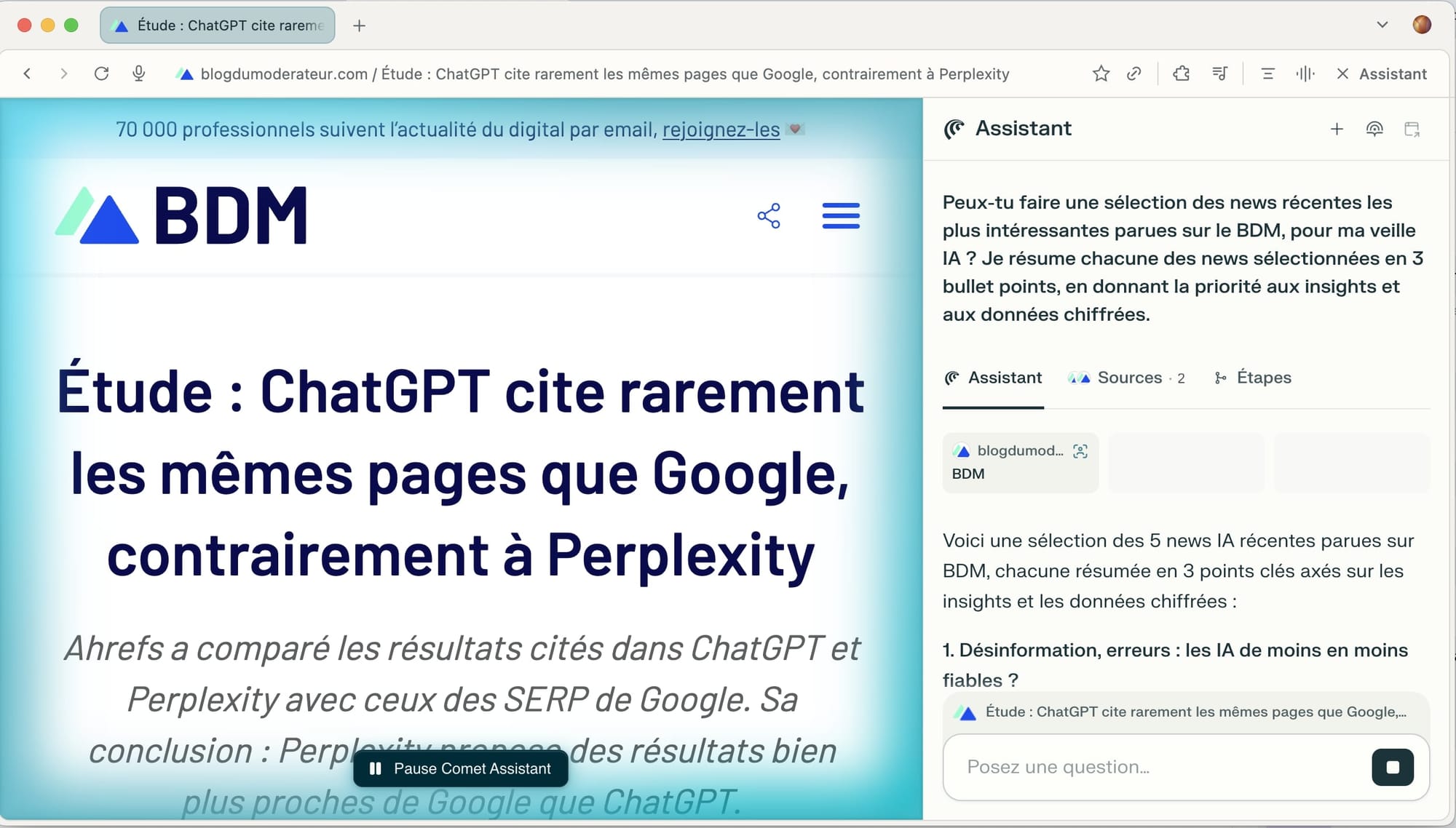 Le minimum pour tout browser IA est l'intégration d'un assistant mobilisable à tout moment, via une barre latérale de chat. C'est le cas ici avec l'Assistant de Perplexity. Il peut vous assister sur la page visitée en vous la résumant ou en répondant à vos questions.