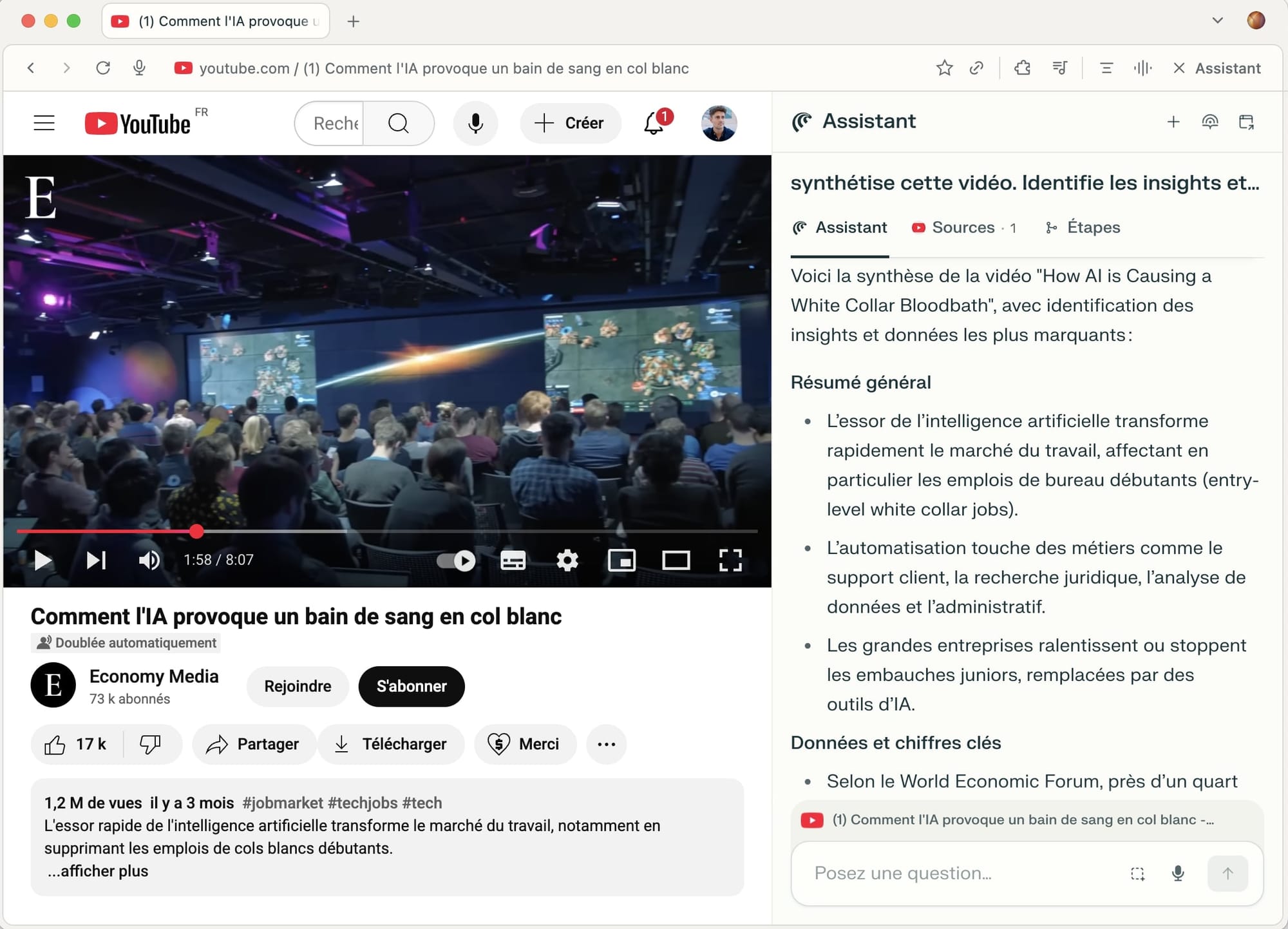 Bonne nouvelle, l'Assistant de Comet est capable de vous résumer une vidéo YouTube (en donnant les principaux enseignements) là où la plupart des chatbots IA (ChatGPT inclus) en sont incapables…