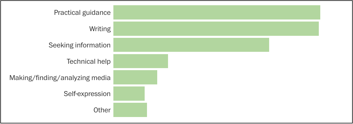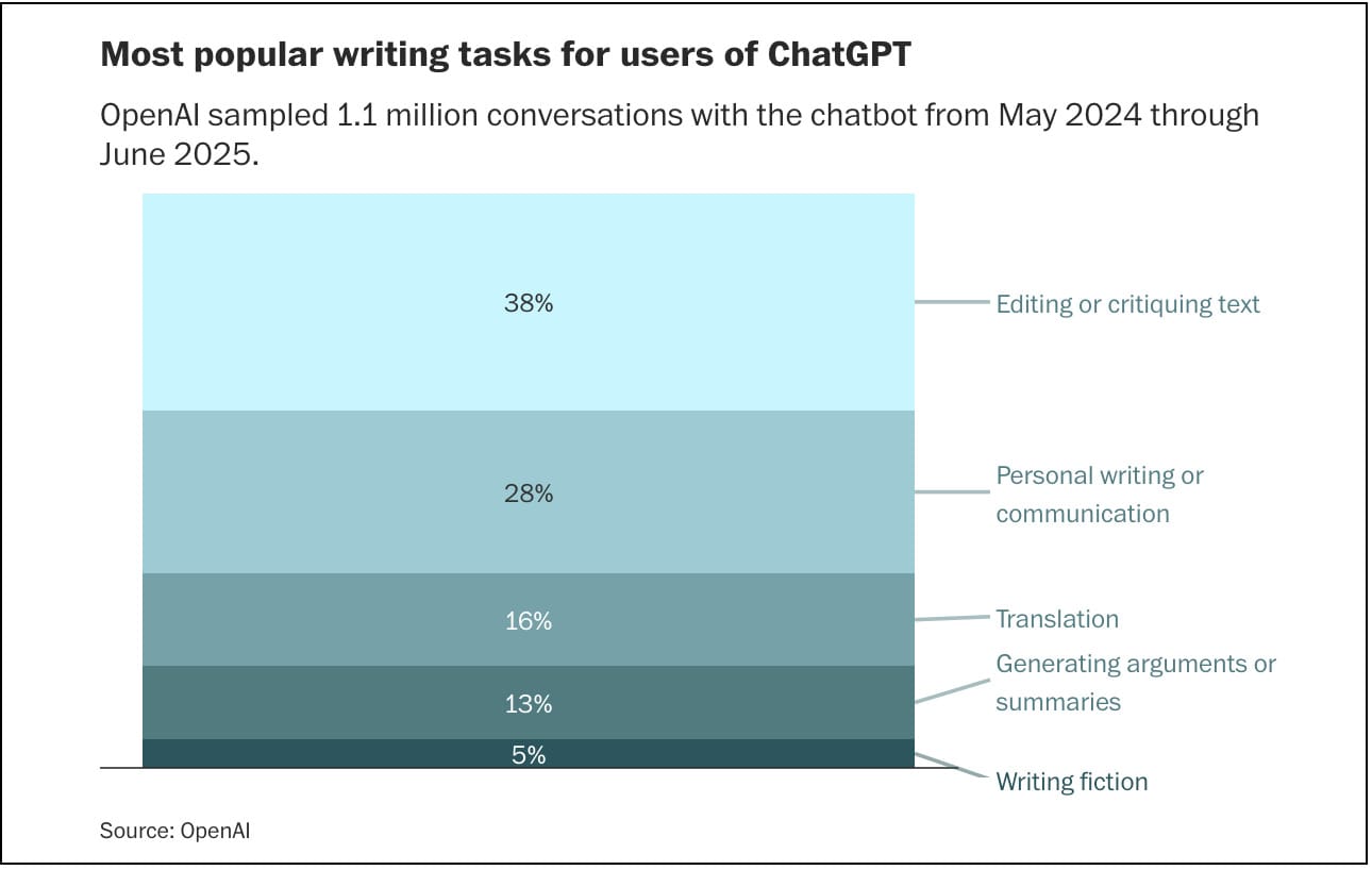 Côté écriture, les conversations concernent surtout édition/critique de texte et aide à la communication personnelle. La traduction représente également une part significative des requêtes.