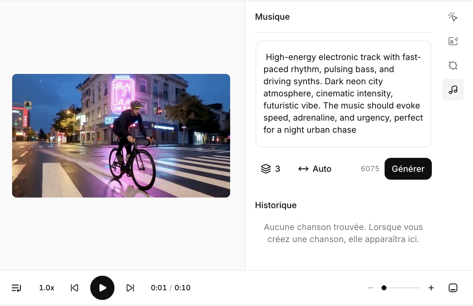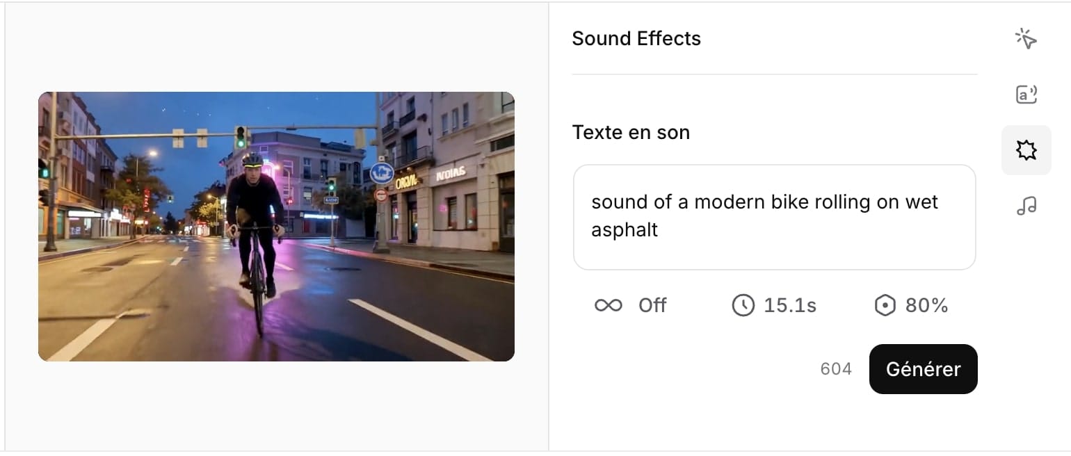 Enfin, vous pouvez également générer un effet sonore en le choisissant parmi une liste de sons pré-générés, ou en le promptant directement. Par exemple, ici :