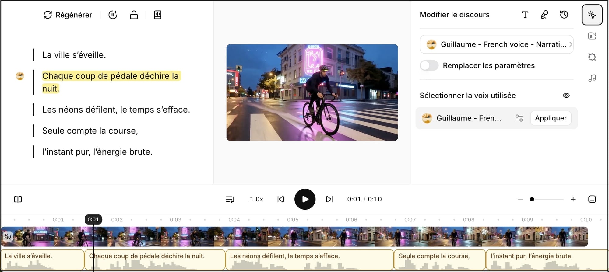 Vous pouvez tout d'abord ajouter une voix off. Saisissez simplement le texte dans la colonne de gauche. Puis choisissez une voix dans celle de droite. Vous observez alors où seront prononcés chaque phrase sur la timeline en bas. À vous d'ajuster en conséquence.