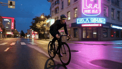 Pour cette démo, on partira d'une vidéo lambda d'un cycliste dans une ville futuriste au petit matin. Voici un extrait (format GIF pour l'embed) :