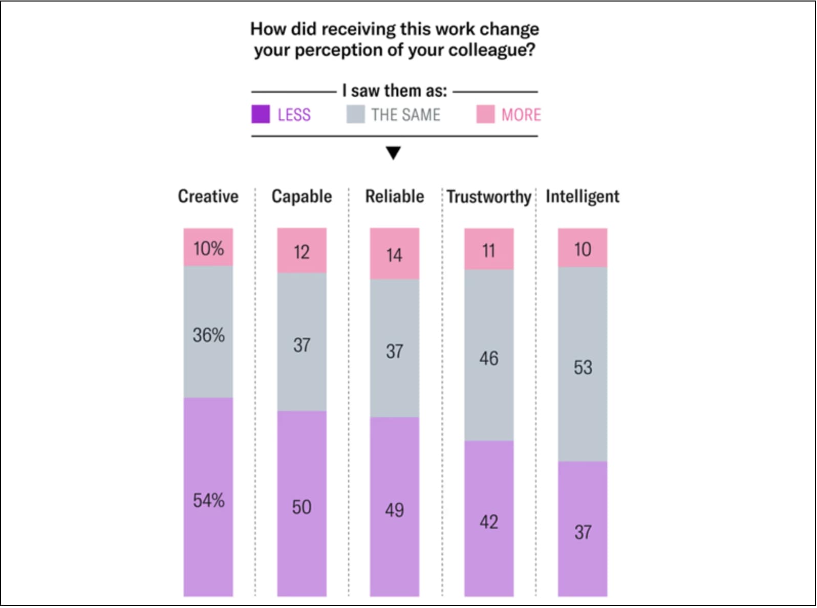 Les salariés montrent déjà un grand mépris à l'encontre des auteurs de workslop : environ la moitié des personnes interrogées les considèrent comme moins créatifs, moins compétents et moins fiables.