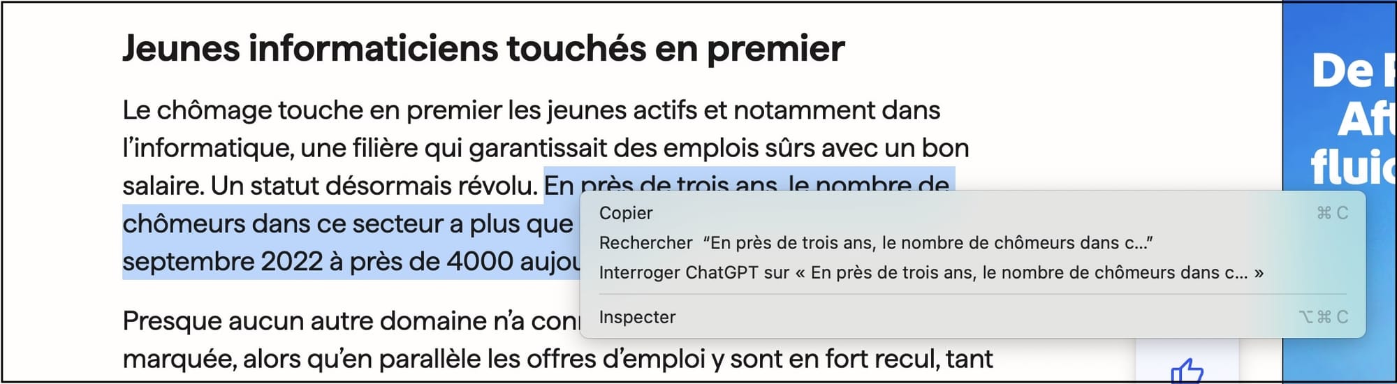 Dans Atlas, cliquez droit sur le texte sélectionné puis "Interroger ChatGPT".
