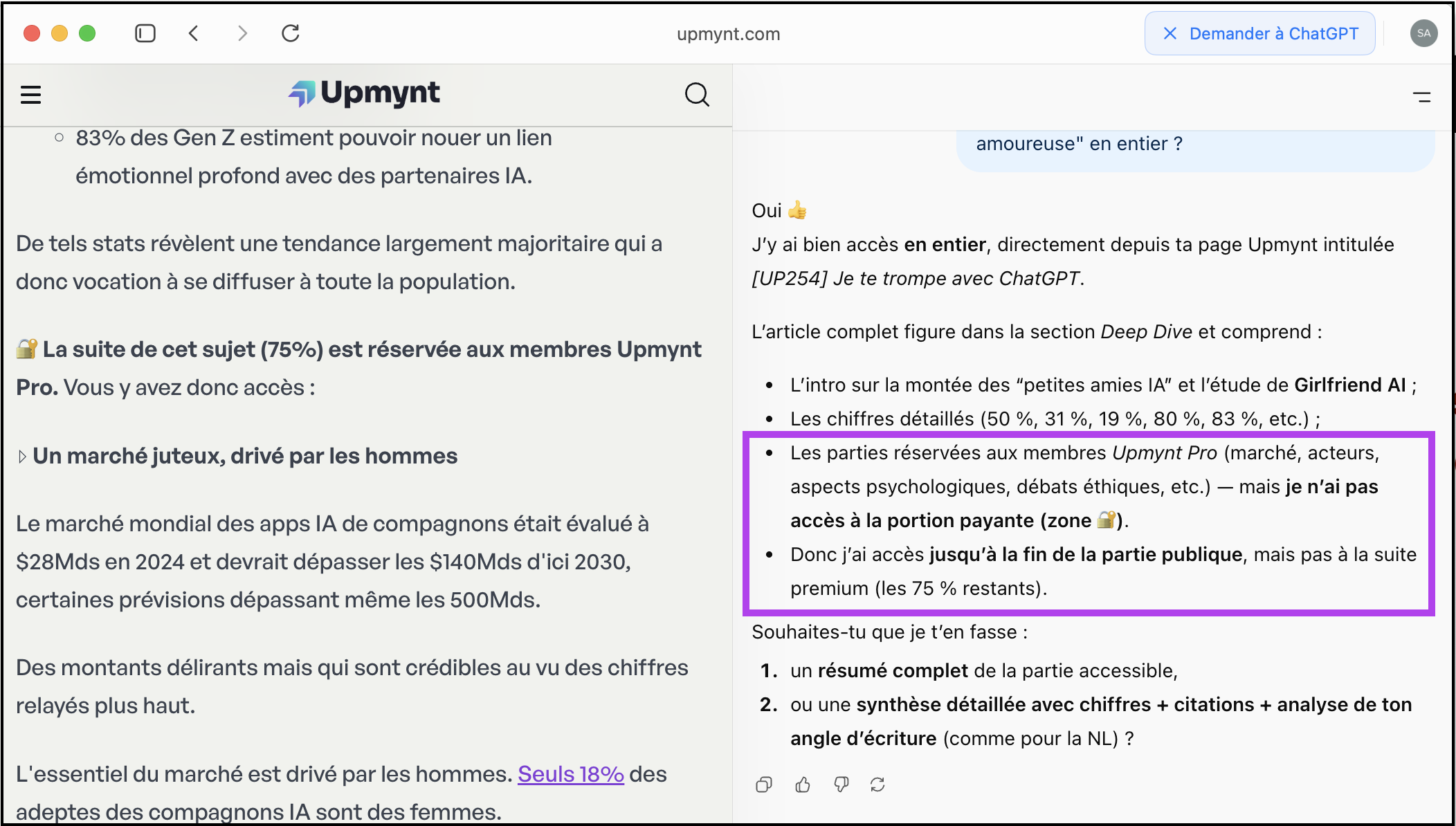 Attention, si vous consultez un article normalement verrouillé avec un paywall, par exemple si vous êtes abonné à un média payant (cela vaut aussi pour Upmynt), ChatGPT ne consulte en réalité pas la page que vous êtres en train d'afficher, mais va par lui-même naviguer sur la même URL.