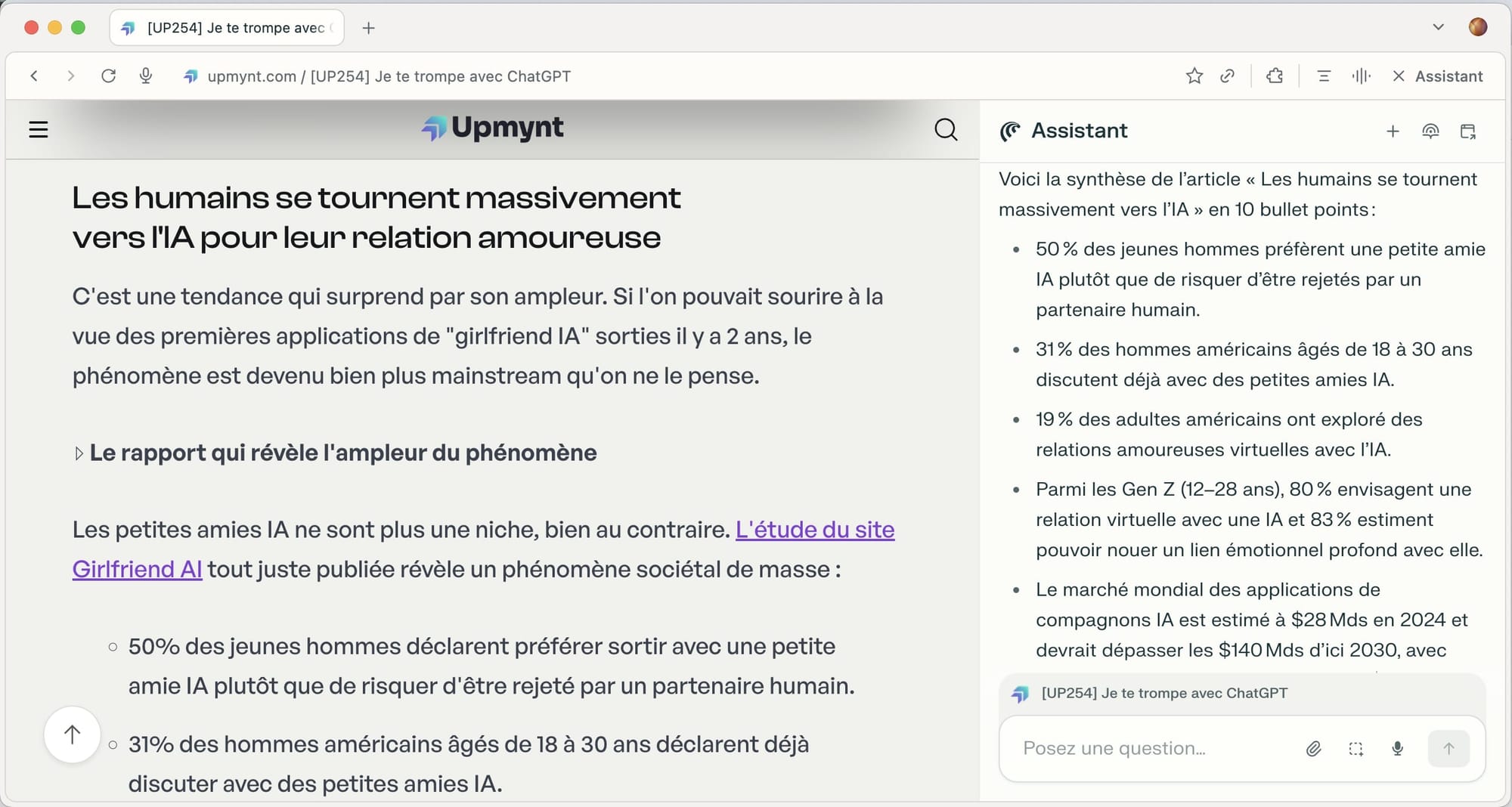 C'est la première fonctionnalité d'un navigateur IA, la possibilité de mobiliser l'assistant à tout moment pendant votre navigation, pour lui poser des questions sur la page visitée.
