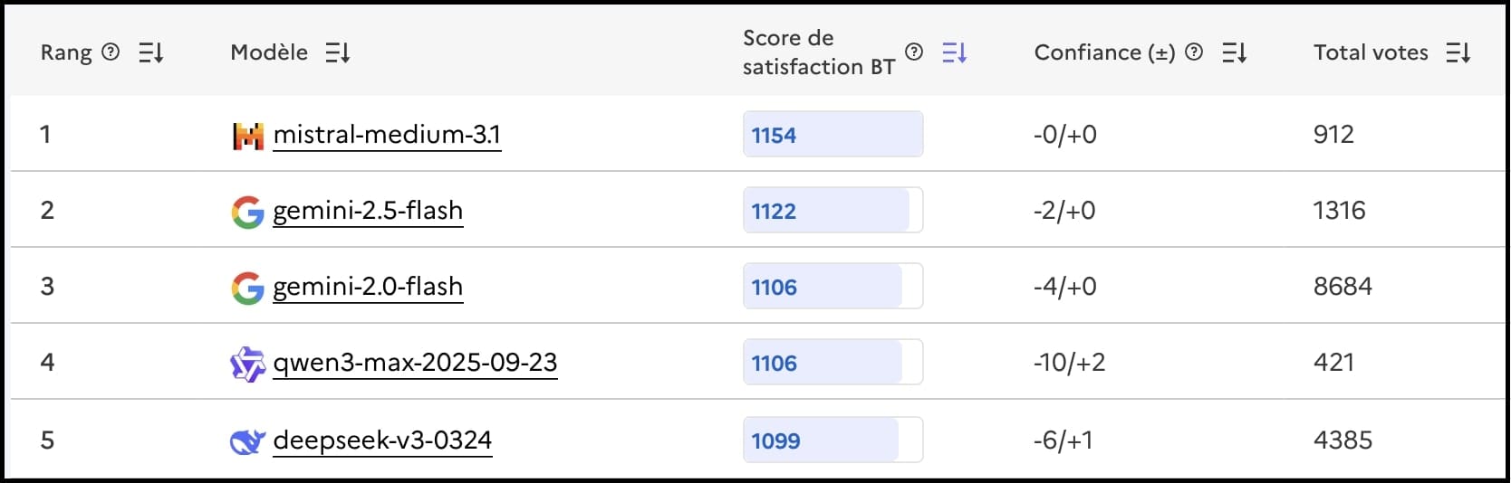 Plus surprenant encore, Mistral Medium 3.1 (la version arrivée en tête) est un modèle "moyen de gamme" de Mistral, conçu pour allier légèreté et performance. Pas une bête de course a priori.