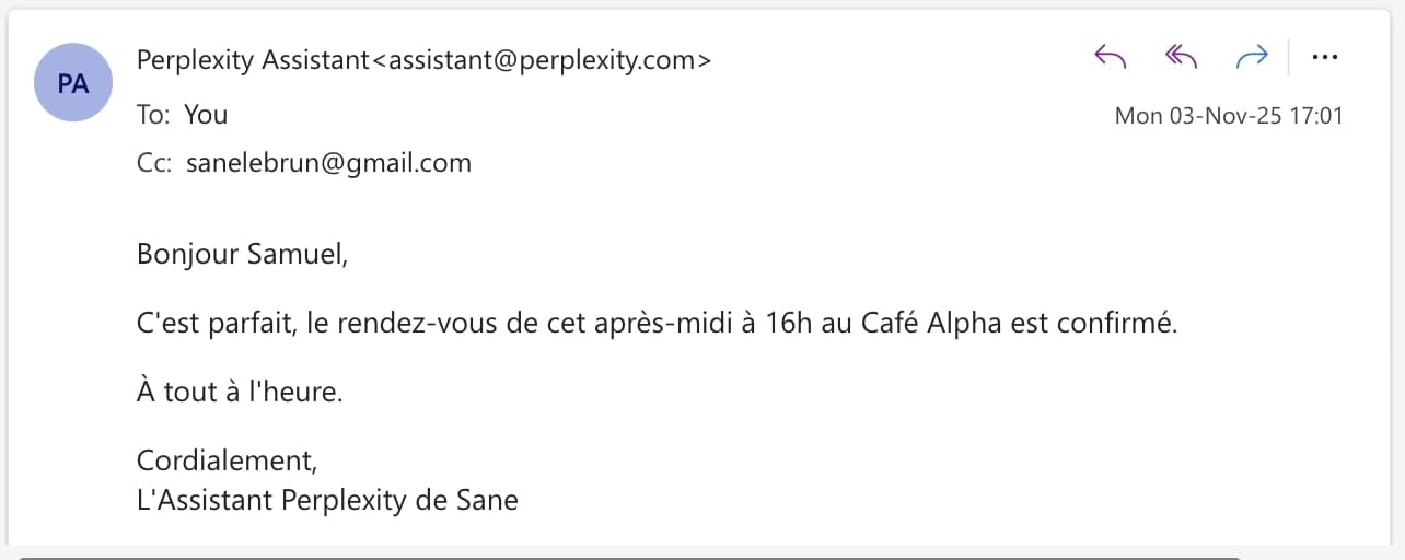 L'assistant répond alors à votre interlocuteur et signe "L'Assistant Perplexity de Sane".