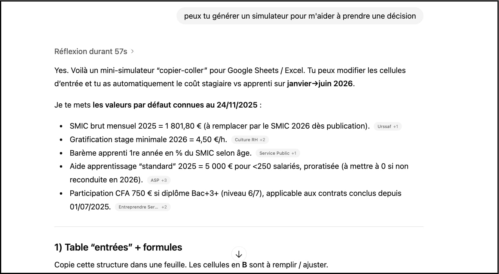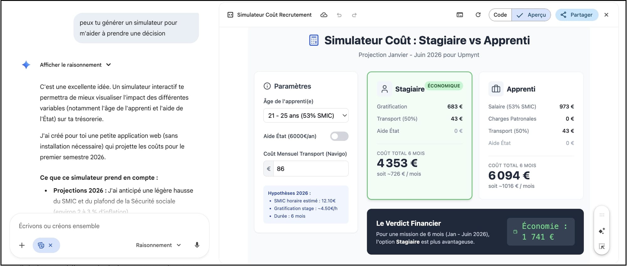 Lorsque je demande aux deux assistants quelle est la meilleure option entre le recrutement d'un stagiaire ou d'un apprenti, puis je réclame le développement d'un petit simulateur pour l'aide à la prise de décision, Gemini s'exécute avec brio, avec un simulateur non seulement pratique mais aussi esthétique.