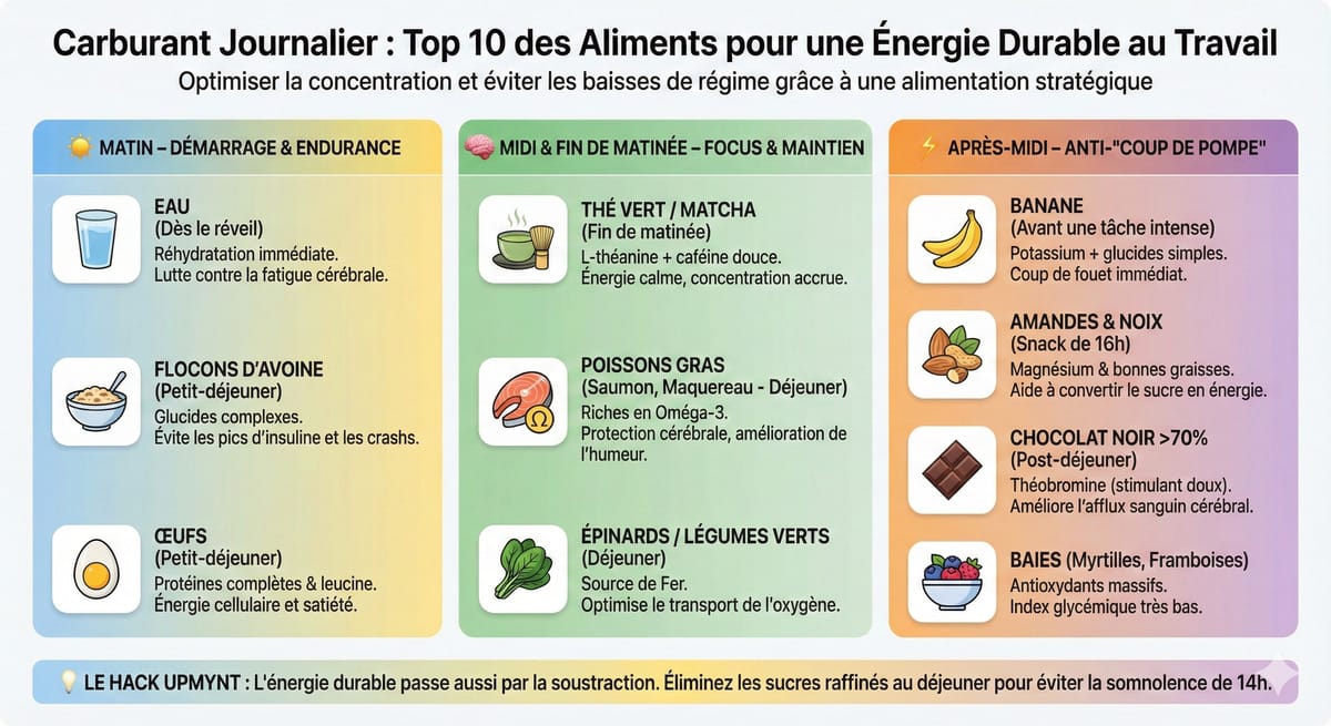 Illustration avec la génération par mes soins d'une infographie sur les meilleurs aliments à consommer pendant la journée :