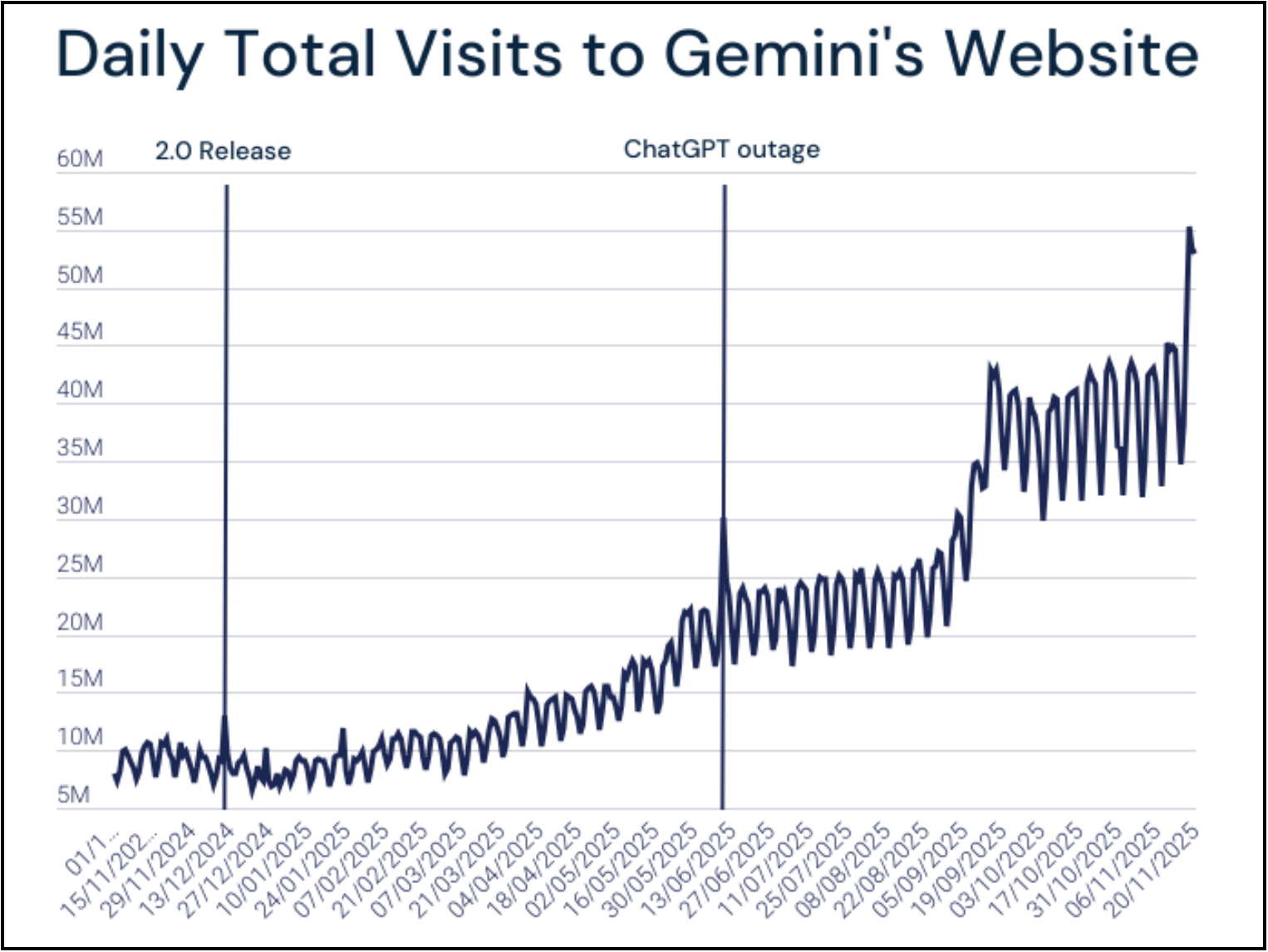 📈 Belle traction. Mois après mois, Gemini croit, et ces derniers jours, le trafic a même pour ainsi dire explosé avec le lancement du modèle Gemini 3.