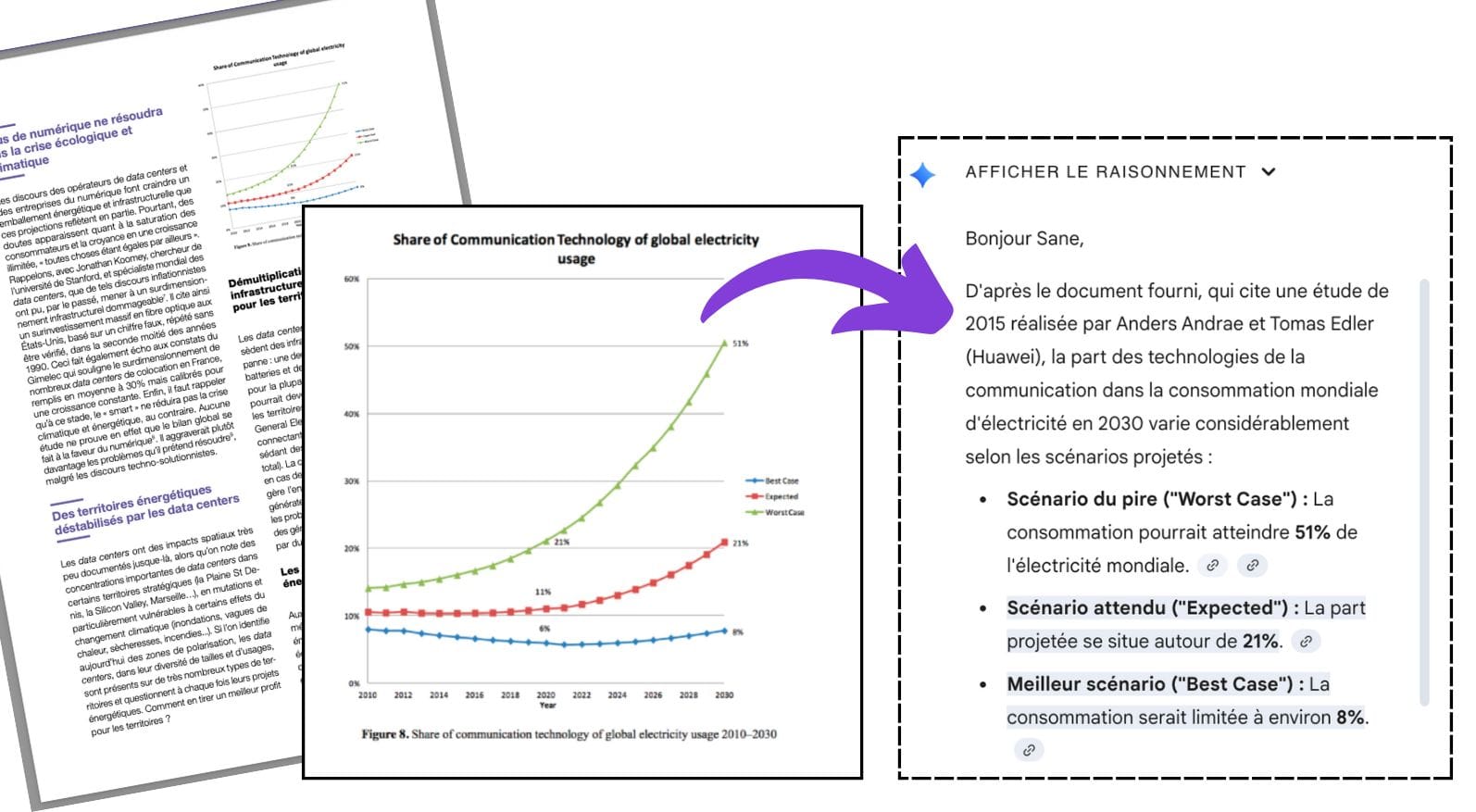Ainsi, dans un rapport PDF sur la consommation énergétique des data centers, Gemini a su décrypter le graphique qui y figure et me répondre précisément en reprenant les infos :