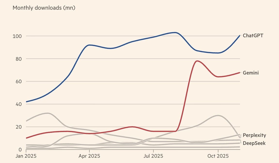 Si ChatGPT reste le chatbot IA le plus populaire avec 85M de téléchargements en octobre, Gemini réduit cependant l'écart avec 64M de téléchargements (x4 versus août !!!).