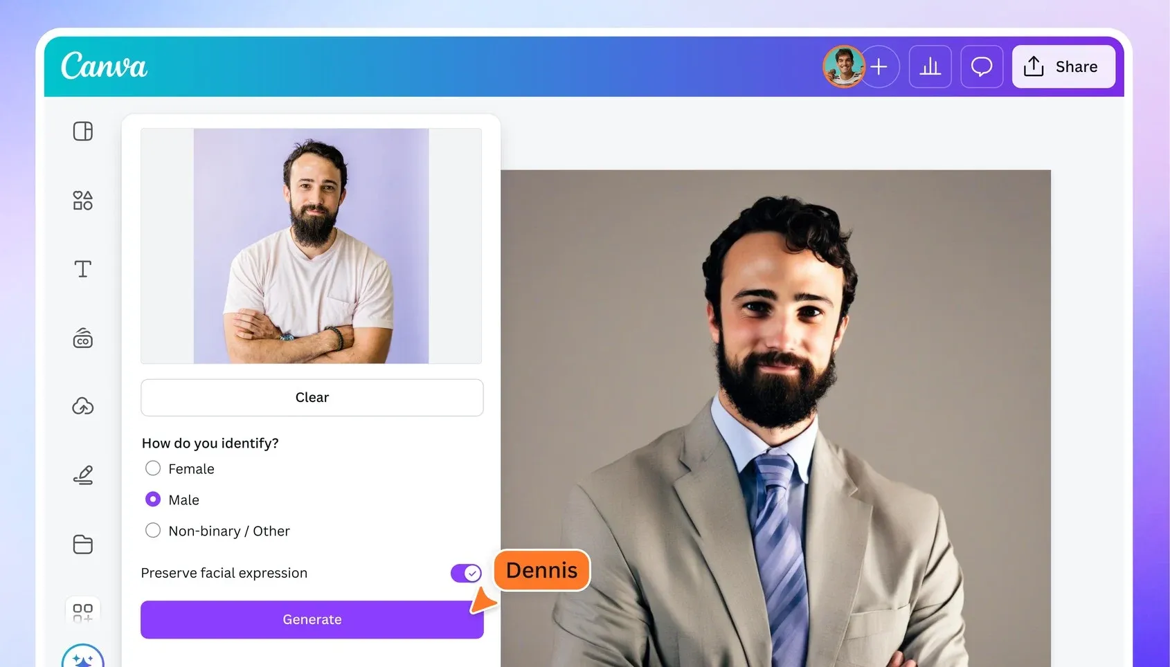 Ce générateur Canva permet de générer en quelques clics une photo professionnelle, à partir de n'importe quel cliché de vous. Un crédit vous est offert toutes les 24 heures, pour une génération.