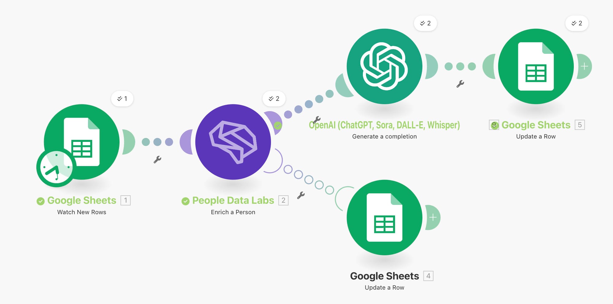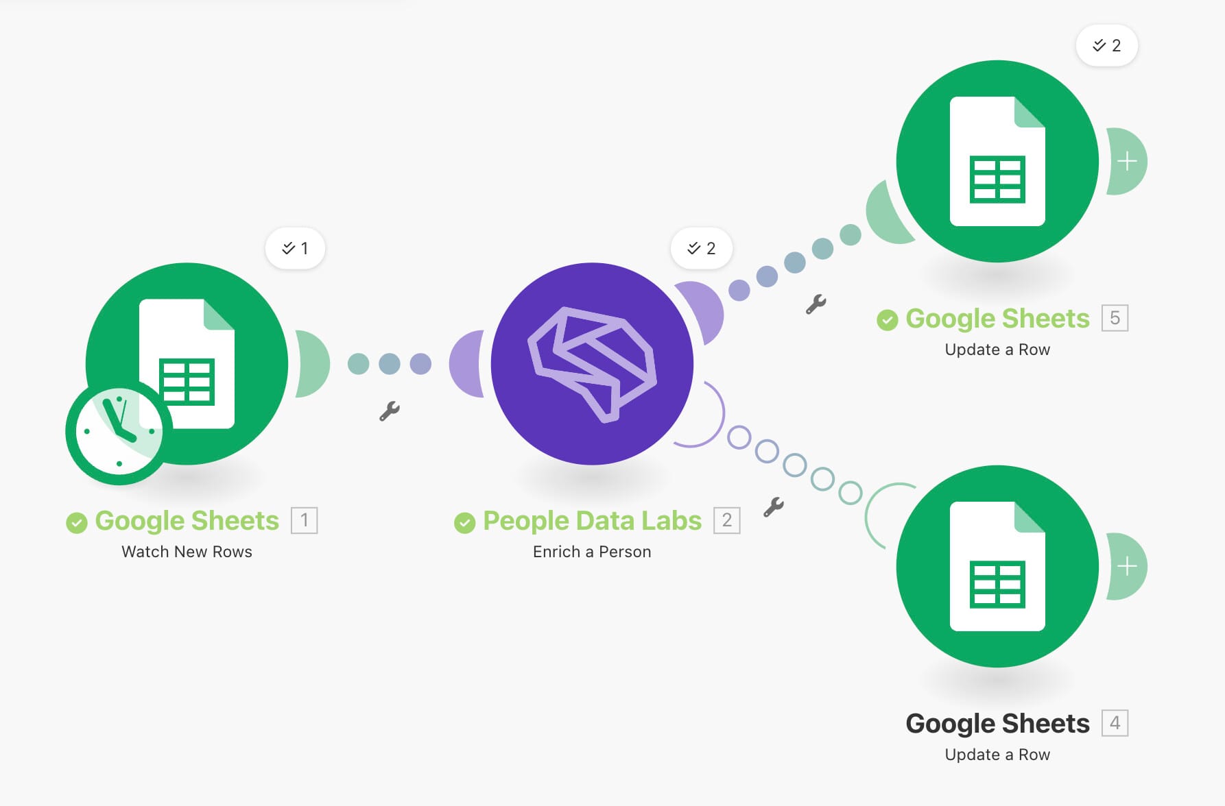 Dans Make, on peut ainsi créer un scénario d'automatisation qui exploitera en particulier un module People Data Labs (PDL) pour permettre l'enrichissement du dit lead avec URL profil Linkedin, nom, localisation, rôle, entreprise.