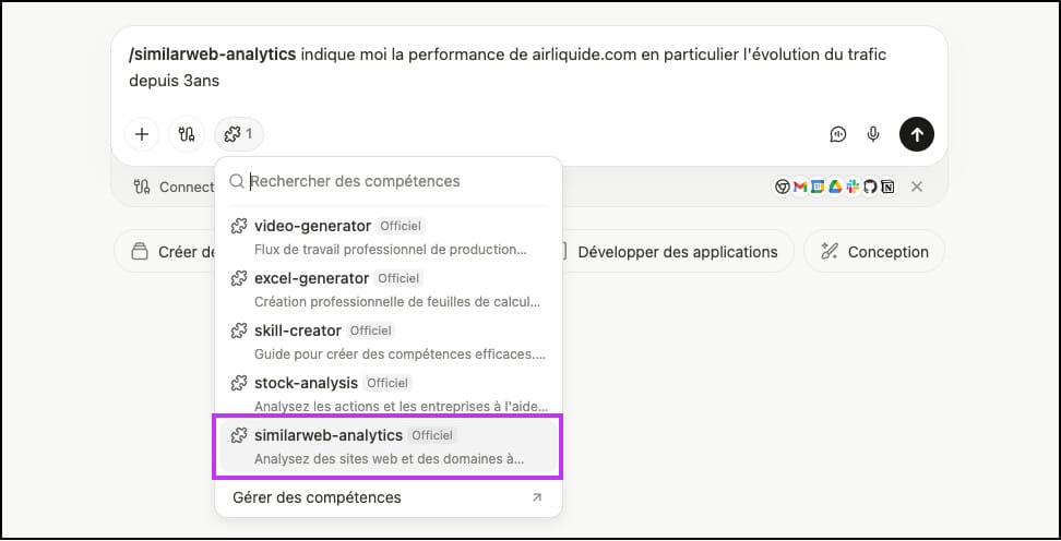 Pour cela, vous devez cliquer sur l'onglet compétences dans la barre de prompt et choisir "similarweb-analytics", puis préciser votre requête en promptant.