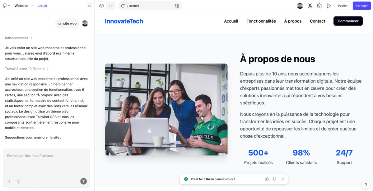 Chaque instruction est appliquée en quelques secondes. Vous itérez jusqu'à obtenir exactement ce que vous voulez.