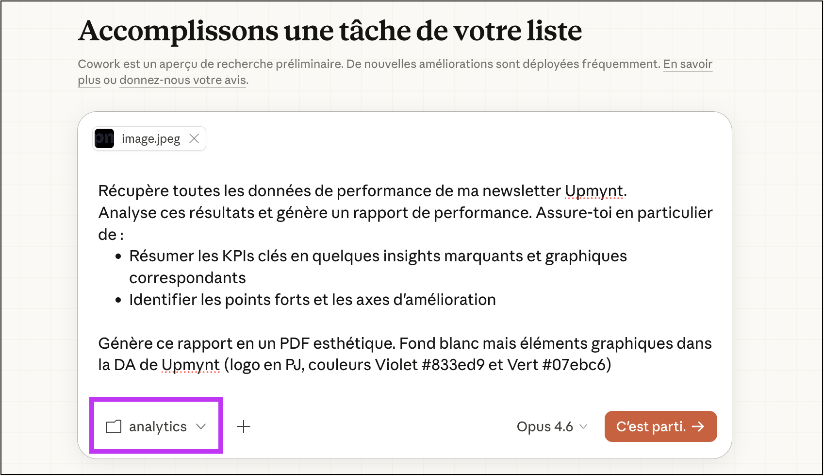 Par exemple, je donne simplement accès à Cowork à mon dossier "analytics" dans lesquels se trouvent 5 tableurs sur la performance de Upmynt depuis 3ans, et je demande de générer un rapport de performance synthétique.
