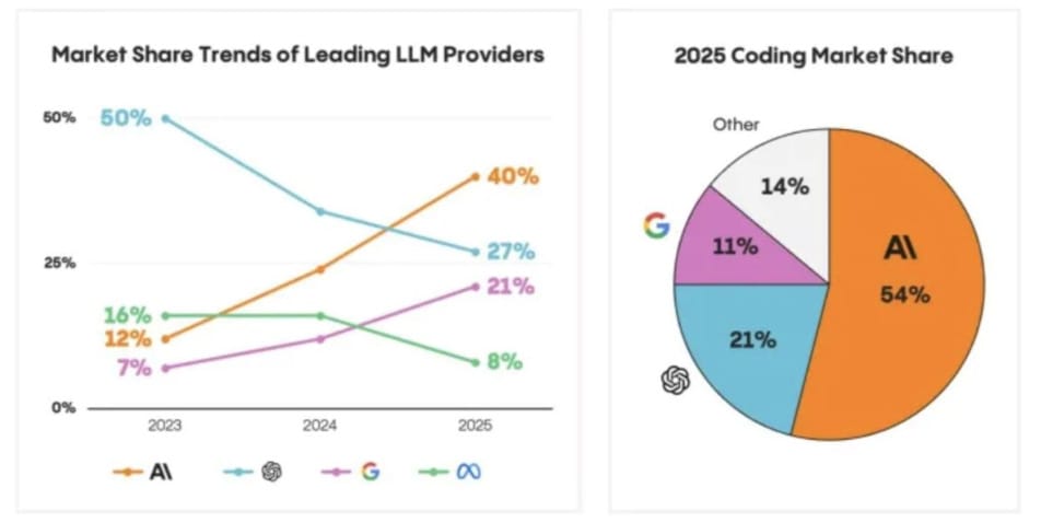 Selon l’étude annuelle de Menlo Ventures, Anthropic est désormais le leader côté B2B auprès des entreprises américaines, avec 40% de PDM, quand OpenAI tombe à 27%.