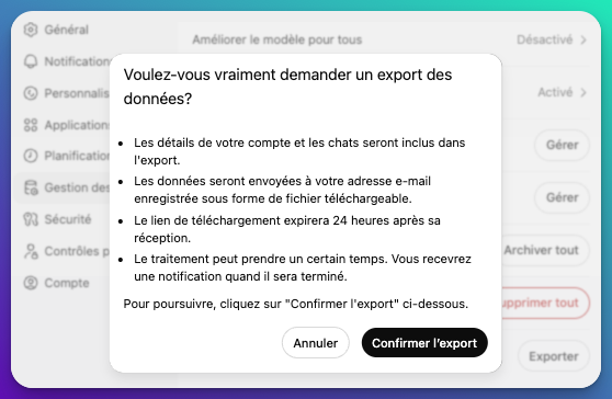 Allez dans ChatGPT → Paramètres → Gestion des données → Exporter les données.