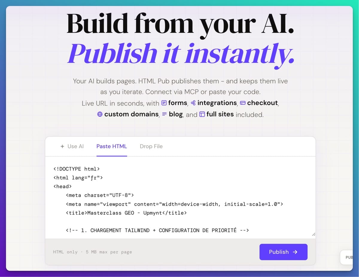 HTML Pub : Si vous vibe codez avec ChatGPT, Claude ou Gemini, vous générez de jolis projets : landing page, présentation, portfolio…