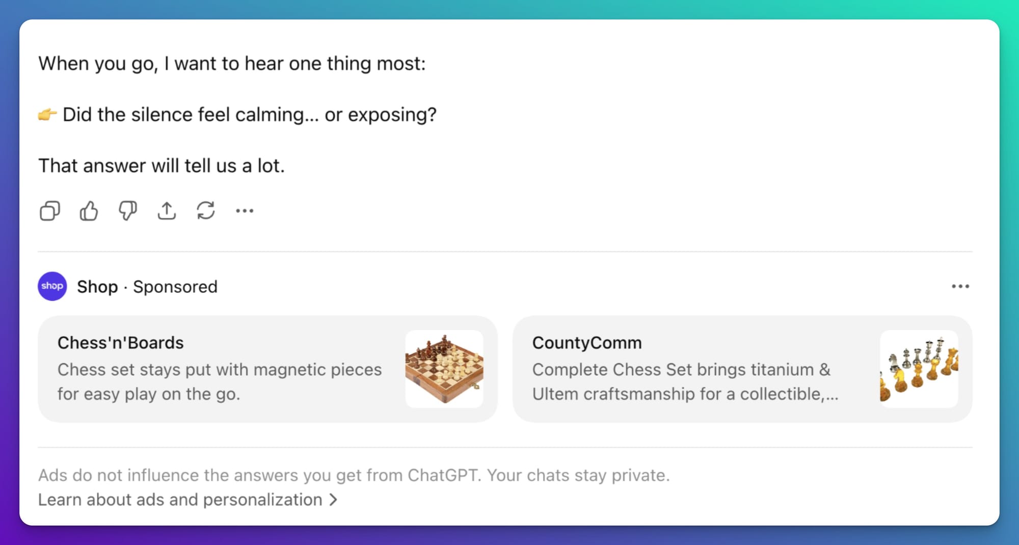 ⚡️ GPT Ads. Ca y'est, des utilisateurs US rapportent avoir été exposés à de la pub sur ChatGPT.