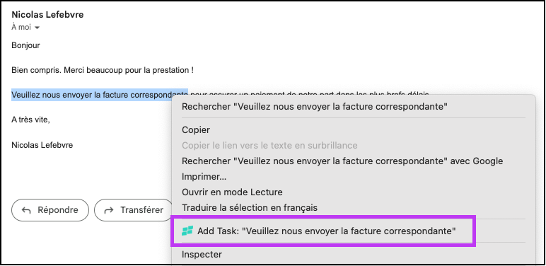 À tout moment lorsque vous visitez une page, vous pouvez demander à l'outil de générer la tâche correspondante. L'IA organise ensuite vos tâches et leur contexte pour vous permettre de garder l'esprit clair.