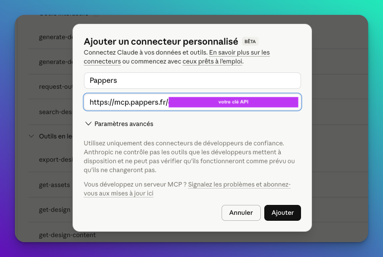 - Ajoutez le connecteur dans votre IA avec l'URL : https://mcp.pappers.fr/ suivi de votre clé API