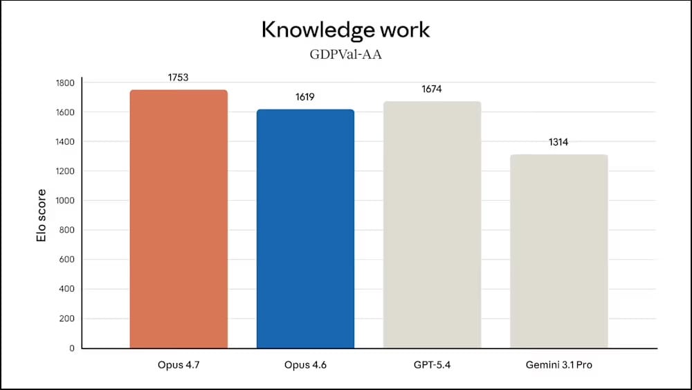 Opus 4.7 reprend la première place sur les benchmarks SWE-bench Pro et GDPVal-AA. Devant GPT-5.4 et Gemini 3.1 Pro.