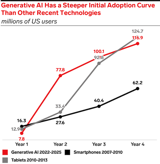 La courbe d'adoption de l'IA générative s'annonce plus raide encore que celle des smartphones ou des tablettes.