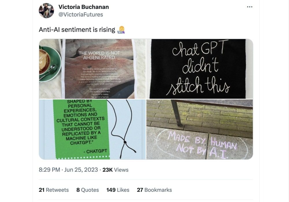 Au-delà d'une rébellion vraisemblablement anecdotique, nous assisterons à la poussée d'un sentiment anti-IA. Il s'accompagnera d'un plébiscite de l'authenticité, voire de l'humain au sens large.