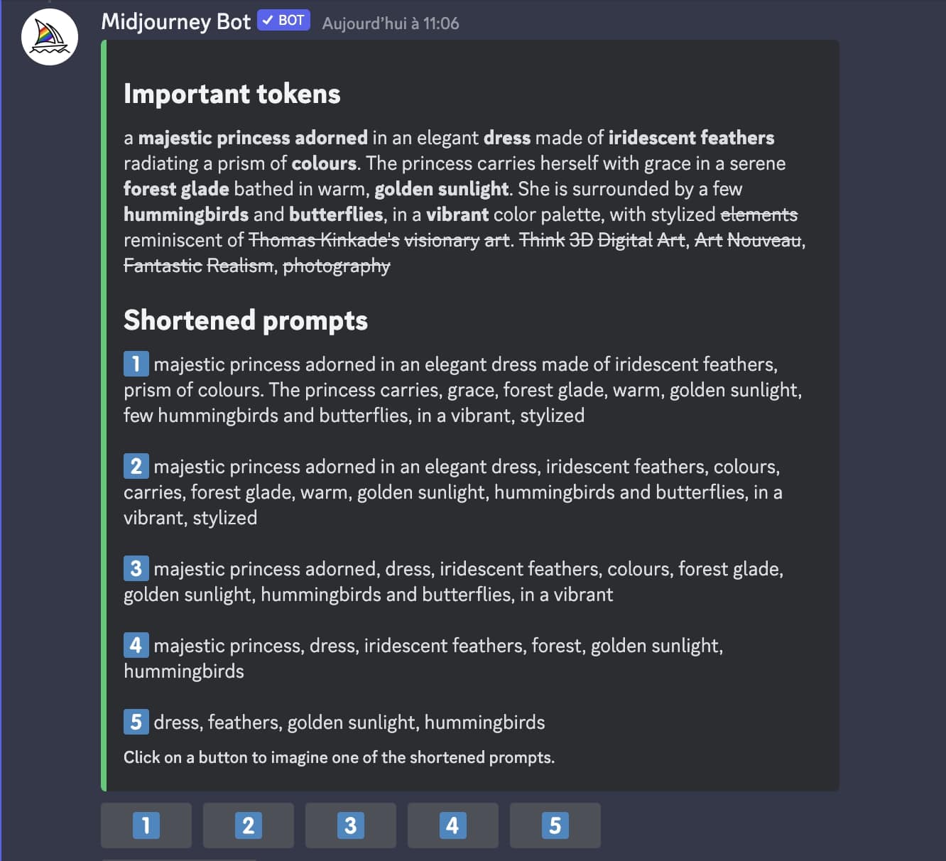 Le Midjourney Bot reprend ci-dessous mon prompt initial en mettant en gras les tokens importants et en barrant ceux jugés inutiles. Puis me propose 5 prompts plus ou moins raccourcis.