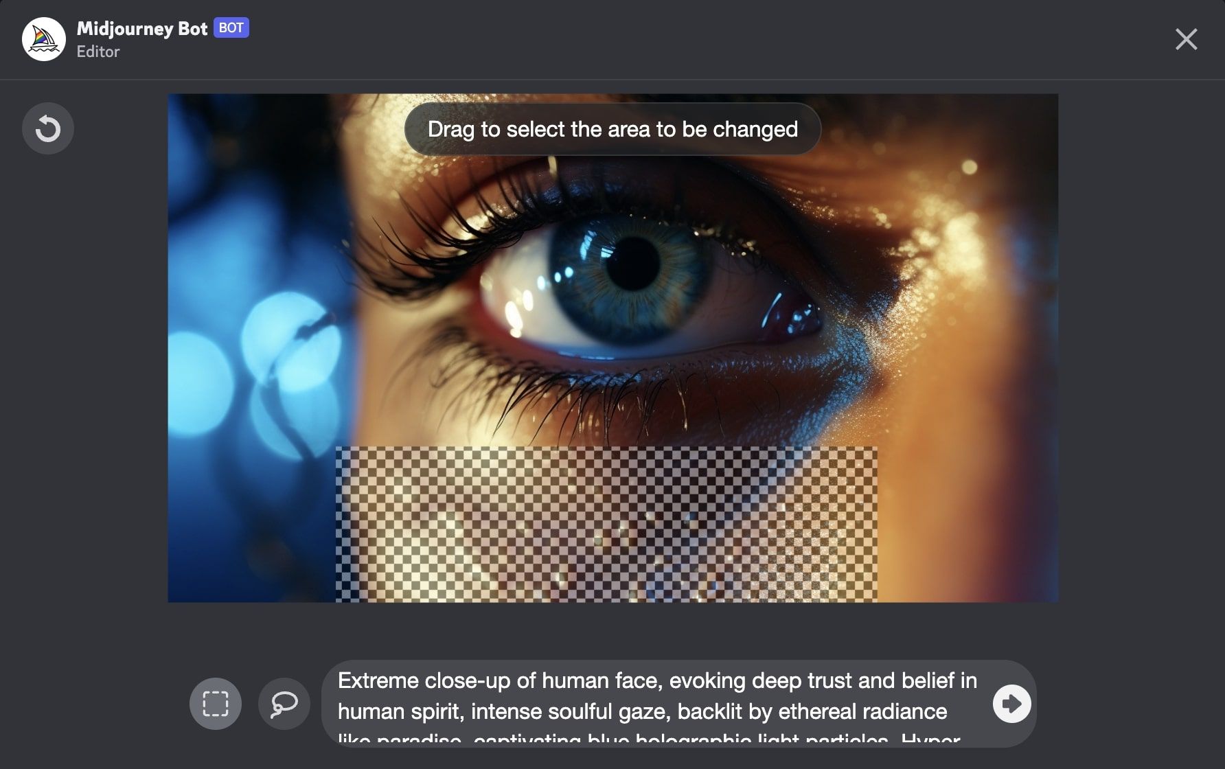 3- Midjourney propose de sélectionner exactement la zone à éditer, et même d'ajuster le prompt si nécessaire.