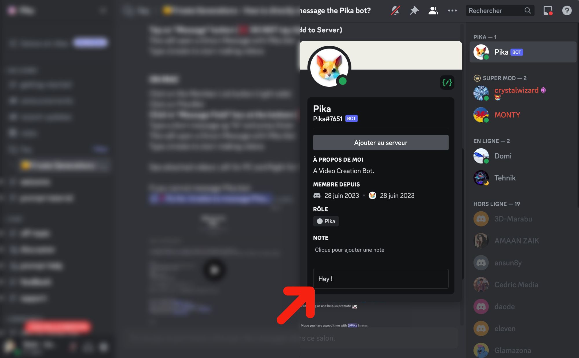 2️⃣ Cliquez sur la liste des membres (en haut à droite), puis sur le "Pika Bot" et saluez-le dans la mini fenêtre de discussion pour démarrer une conversion privée avec lui.