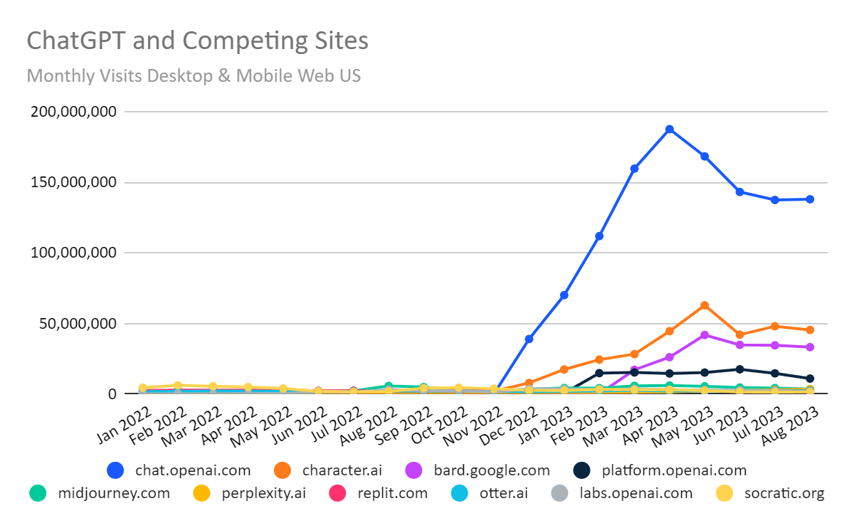 Une baisse de 14% en 2 mois alors que l'engouement intact autour de l'IA et les améliorations régulières de ChatGPT devraient susciter un trafic en hausse constante.