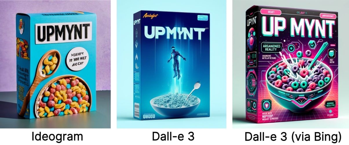 Par exemple, j'ai imaginé Upmynt comme… une marque de céréales. Et j'en ai profité pour comparer la performance de Ideogram versus Dall-e 3.