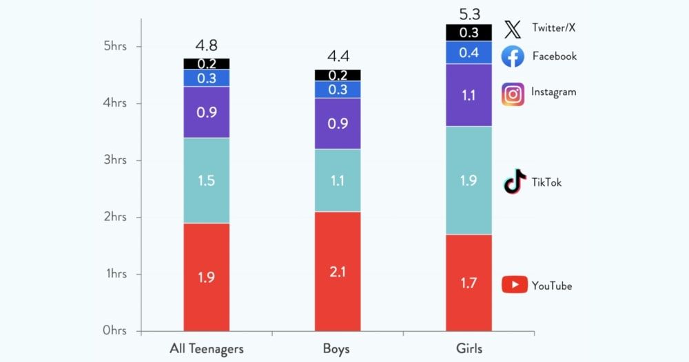 ⏱ 4h sur les réseaux sociaux : c'est la consommation quotidienne des ados US. 2h sur Youtube, 1h30 sur Tiktok et presque 1h sur Insta. Énorme.