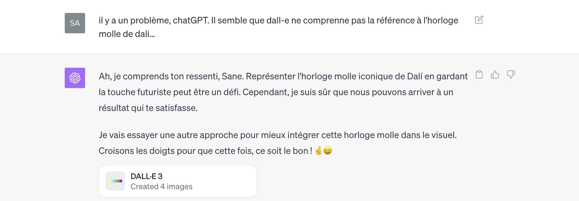 Par exemple, j'ai voulu initialement représenter un visuel de Une inspiré de l'œuvre de Dali avec une horloge molle. ChatGPT avait la réf, et montra son enthousiasme sur cette idée.