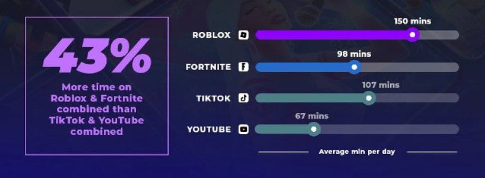 👾 Passion Roblox. Les ados US passent en moyenne 43% plus de temps sur le métaverse gaming - Roblox & Fortnite - que sur les deux plateformes sociales les plus populaires, YouTube et TikTok.