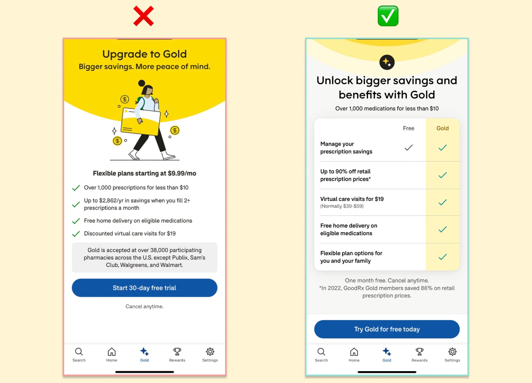 Illustration avec ce A/B test pour GoodRx, un e-shop américain de parapharmacie en ligne qui incite à la conversion pour son plan premium (équivalent de Amazon Prime) :