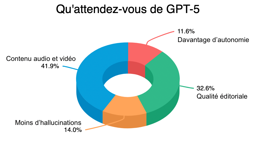 Une prochaine version de ChatGPT, propulsée par GPT-5 (attendu cet été), devra inclure la génération audio et vidéo. C'est le souhait de 42% d'entre vous.